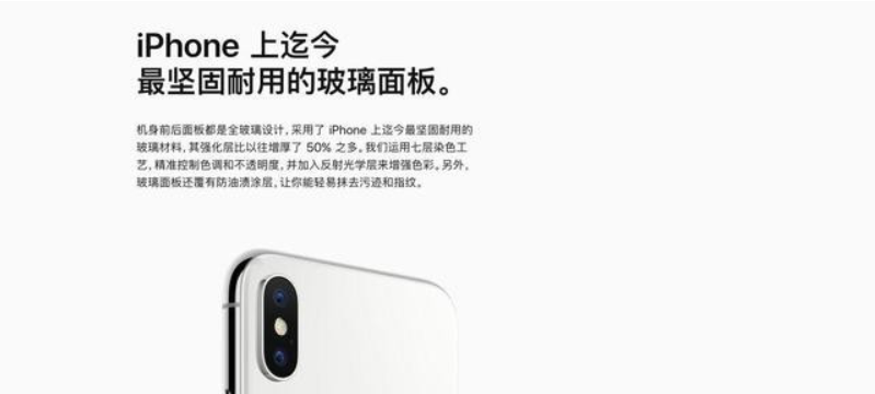 在苹果官网的iPhone X介绍界面,提到iPhone X的后盖玻璃,经过特殊处理强度层增加50%