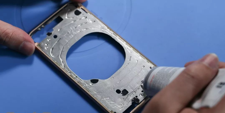 6、在清理完毕的金属框上涂抹玻璃后盖特殊固定胶水
