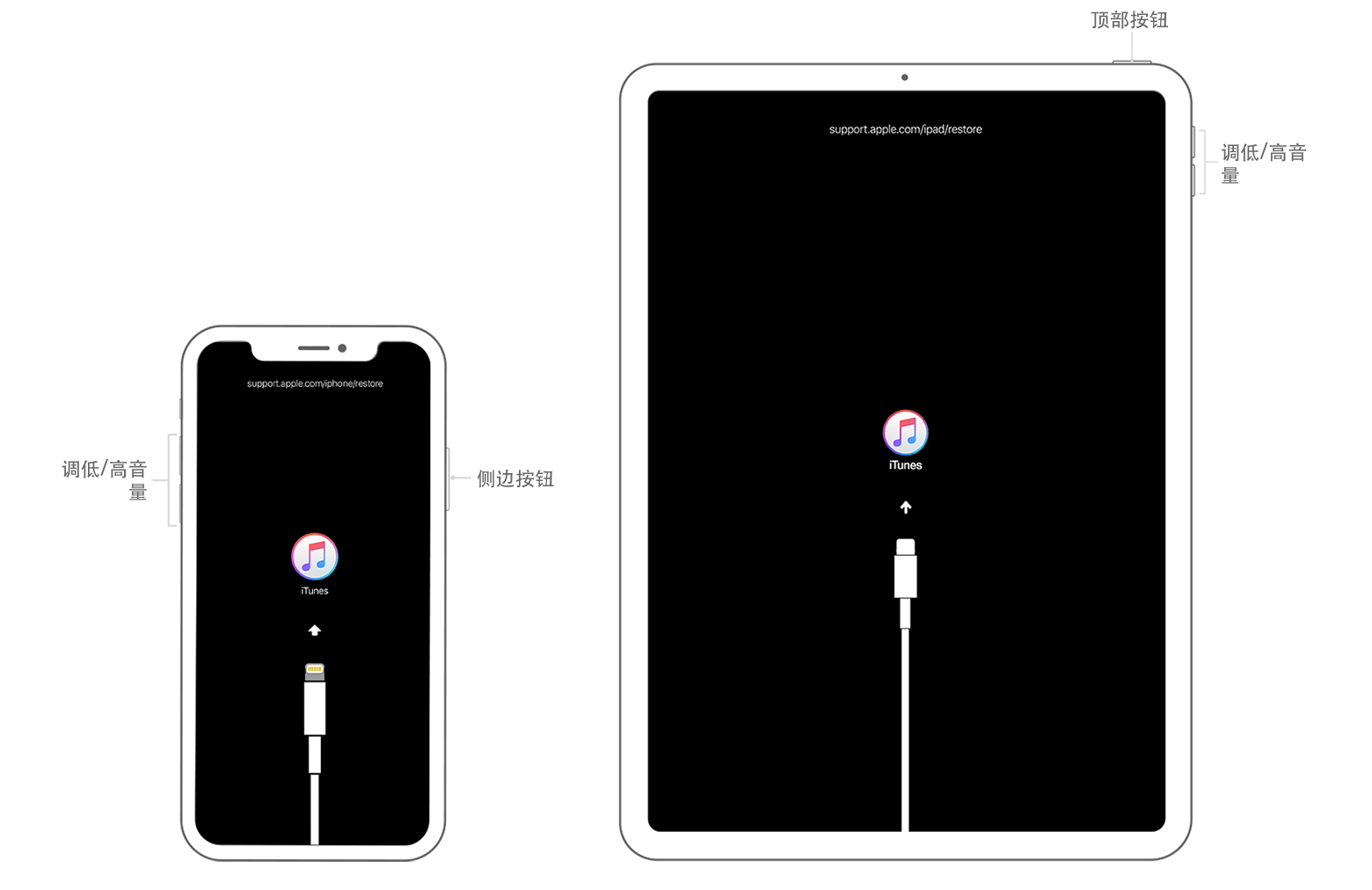 - 配备面容 ID 的 iPad:按住顶部按钮和任一音量按钮,直到出现关机滑块。拖移这个滑块以将您的设备关机。在按住顶部按钮的同时,将设备连接到电脑。继续按住顶部按钮,直到看到恢复模式屏幕。