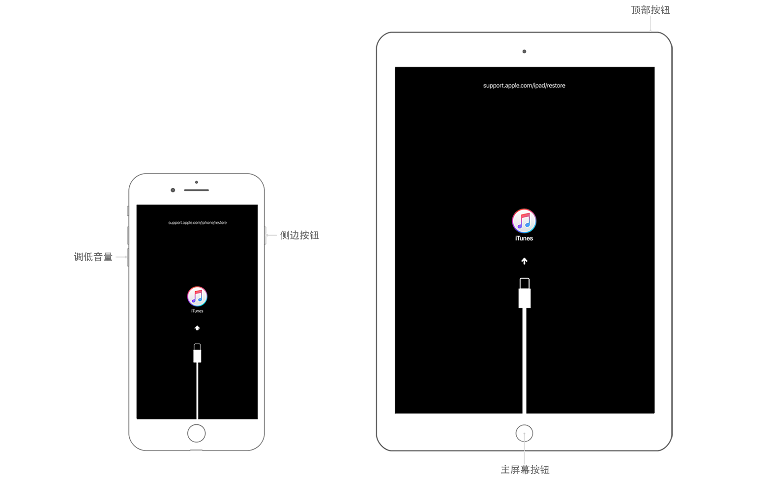 - iPhone 6s 或更早机型、iPod touch(第 6 代或更早机型)或者配备主屏幕按钮的 iPad:按住侧边(或顶部)按钮,直到出现关机滑块。拖移这个滑块以将您的设备关机。在按住主屏幕按钮的同时,将设备连接到电脑。继续按住主屏幕按钮,直到看到恢复模式屏幕。
