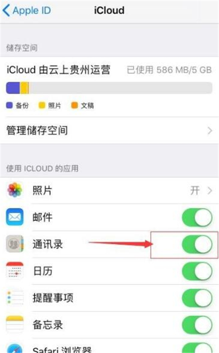 4、进入到Icould的操作界面后,找到“通讯录”选项,点击关闭右侧的按钮。