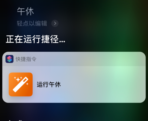 7、最后,在设置完成以后,我们还可以把这条快捷指令添加到 Siri 中。比如添加一条名为“午休”的语音命令。以后只要激活 Siri 并说“午休”就可以自动运行“午休”快捷指令了。