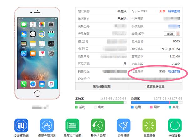 可以借助一款苹果辅助软件i4 爱思助手来确认故障,这个软件可以读取iPhone基本信息,其中有一项功能就是检测苹果电池电量寿命这一功能。
