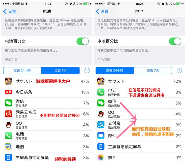 在iPhone设置-------→电池一项 可以看到在过去24小时 与 过去 7天 各个软件耗电的统计情况。