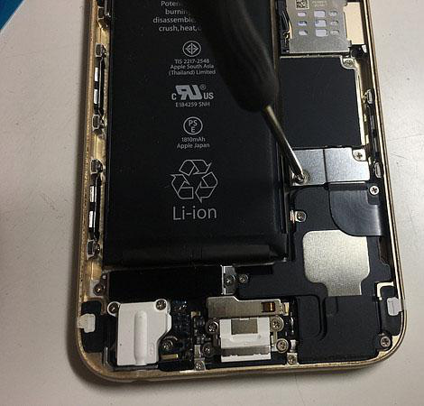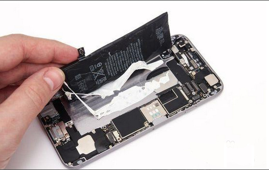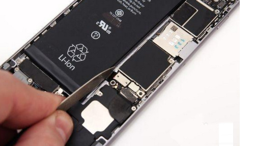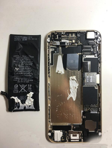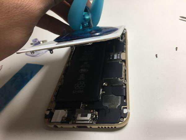 用电吹风加热后盖,把胶水吹软。iPhone6使用了大量胶水来固定电池,它们需要软化才能把电池取下来。用电吹风加热手机后盖,达到软化胶水的目的。不要使用温度比这更高的加热工具,要以加热是仍能舒服将把手机拿在手中为度。使用信用卡或者塑料拨片慢慢撬开电池。