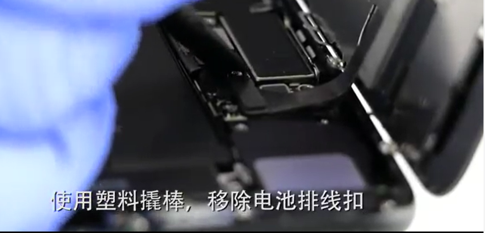 - 使用手机撬棒的平口端,慢慢托起电池连接器然后移除。(注意:小心撬起电池连接器,不要误将电池连接器的固定槽撬起来,如何误操作您将损坏电池连接器。)