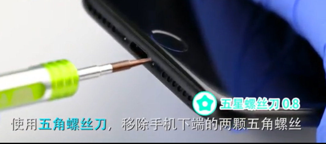 移除2颗位于充电插口旁边的五角螺丝。PS:千万不要用错螺丝刀,用错螺丝刀会导致螺丝滑丝。