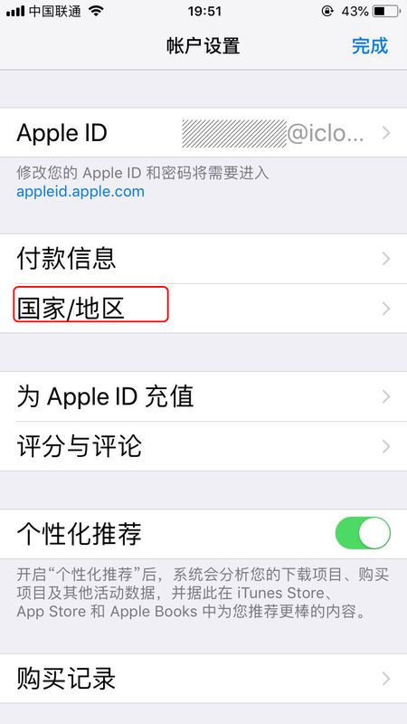 3、在输入Apple ID账号密码,打开国家/地区一栏。