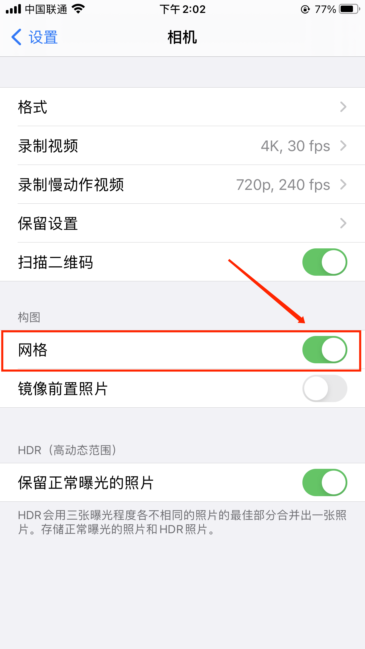 和安卓手机不同,苹果手机的原生相机网格是不能在相机中打开的,需要在设置中开启网格选项。