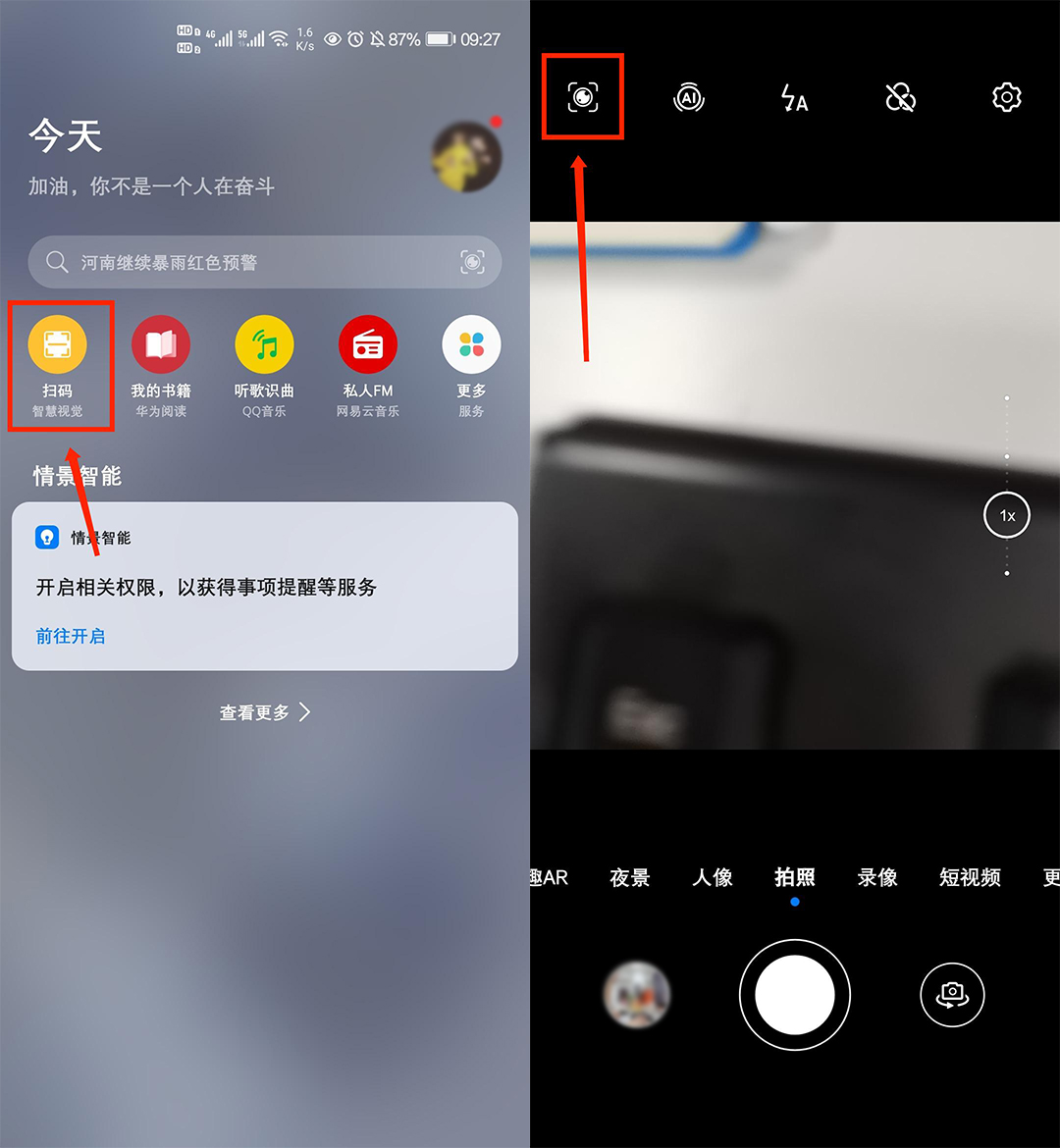 第五步:回到主页,将屏幕左拉到底就可以看到<智慧视觉>的功能;或者打开<相机>,<智能视觉>功能开启后可以在<相机>页面中看到小标识,可以直接启动<智慧视觉>功能。