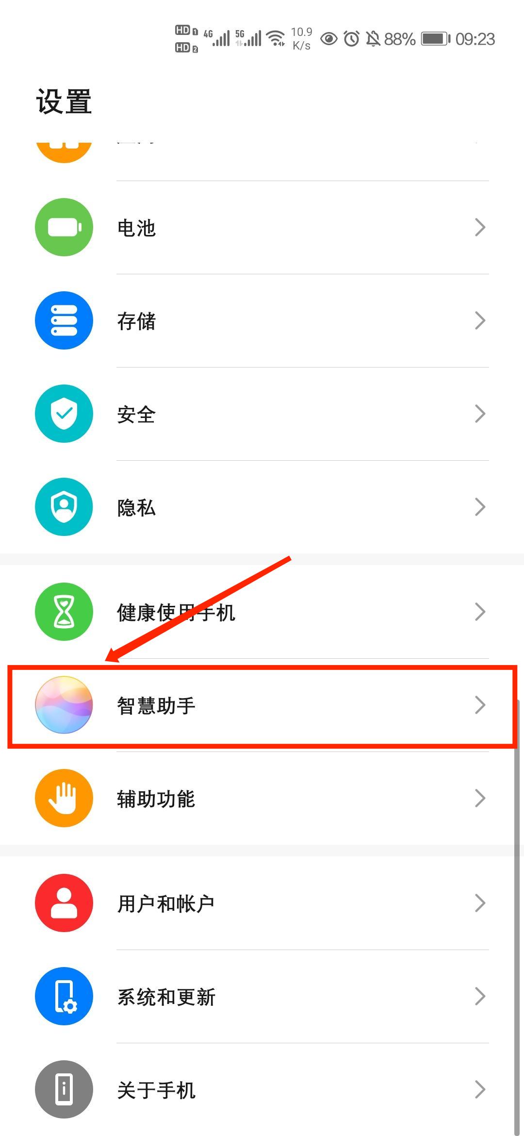 第二步:在设置页面中找到<智慧助手>选项,选择进入。